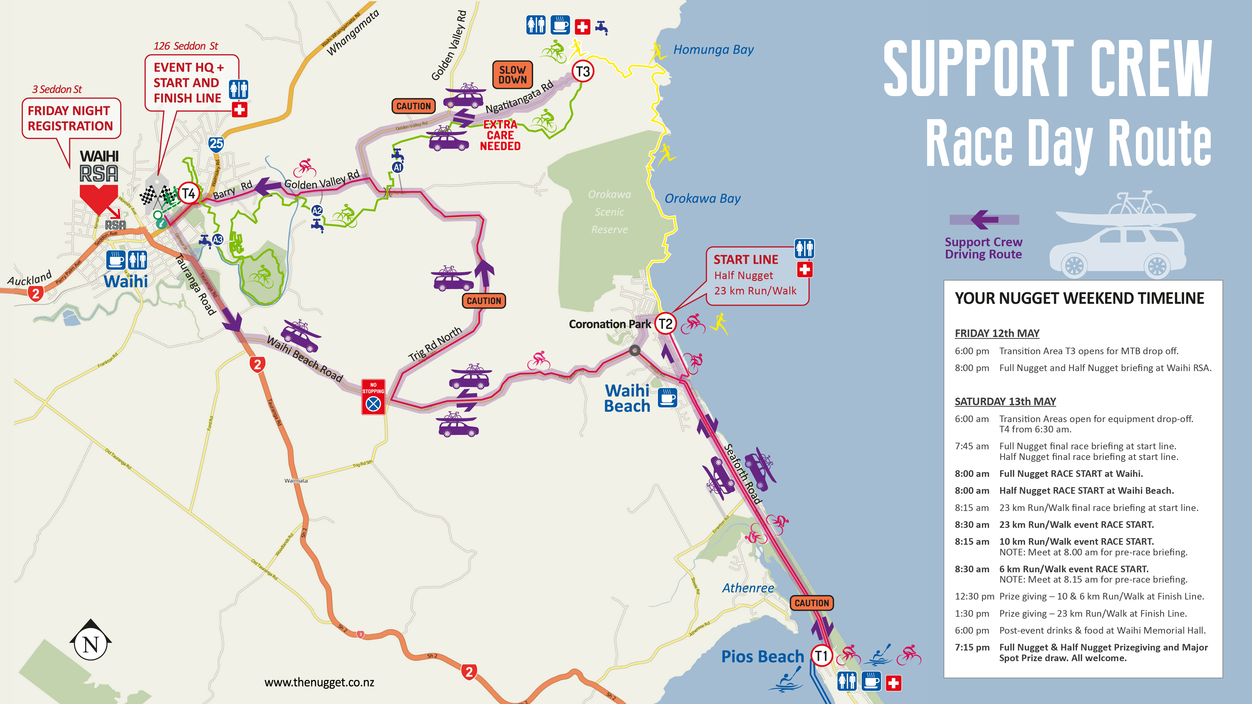 The full race briefing for all Full Nugget and Half Nugget competitors is at 8:00 pm Friday night at the Waihi RSA, 71 Seddon Ave. It is highly recommended that all Full Nugget and Half Nugget competitors (teams, individuals), and a support crew member attend this briefing. We will explain race details and logistics, and update you on any last minute course changes, and we'll also advise you about any hazards out on the course, our safety procedures for race day.